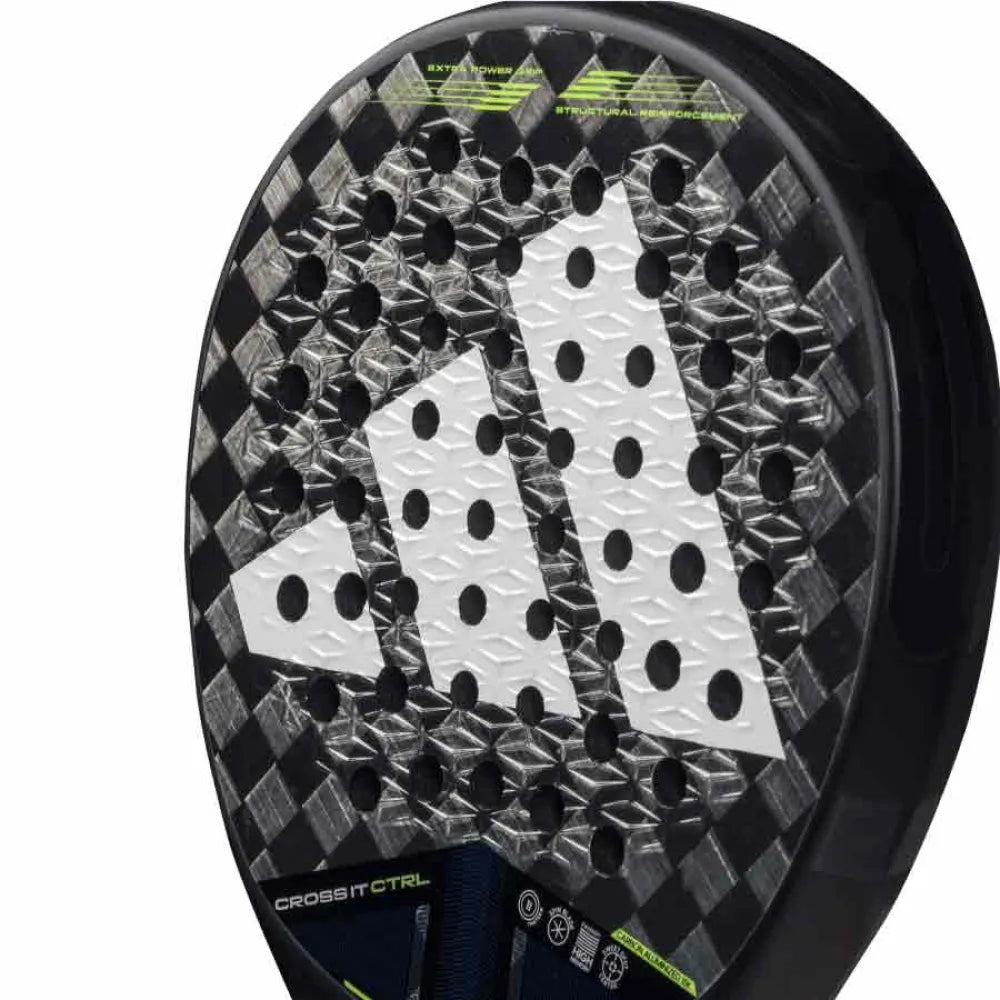 The Adidas Cross IT CTRL 2025 features a rounded shape combined with 15K carbon and High Density EVA foam, delivering outstanding control, power, and comfort for advanced players. Engineered for those who demand precision and mastery in every shot. It incorporates the most advanced technologies: Dynamic Air Flow with open core holes to reduce air resistance and enhance maneuverability; Power Extra Grip with an extended grip length to boost shot inertia and power; 11 Thirteen, a specific hole configuration that optimizes stiffness, power, and durability; and Spin Blade Decal to improve control and spin.