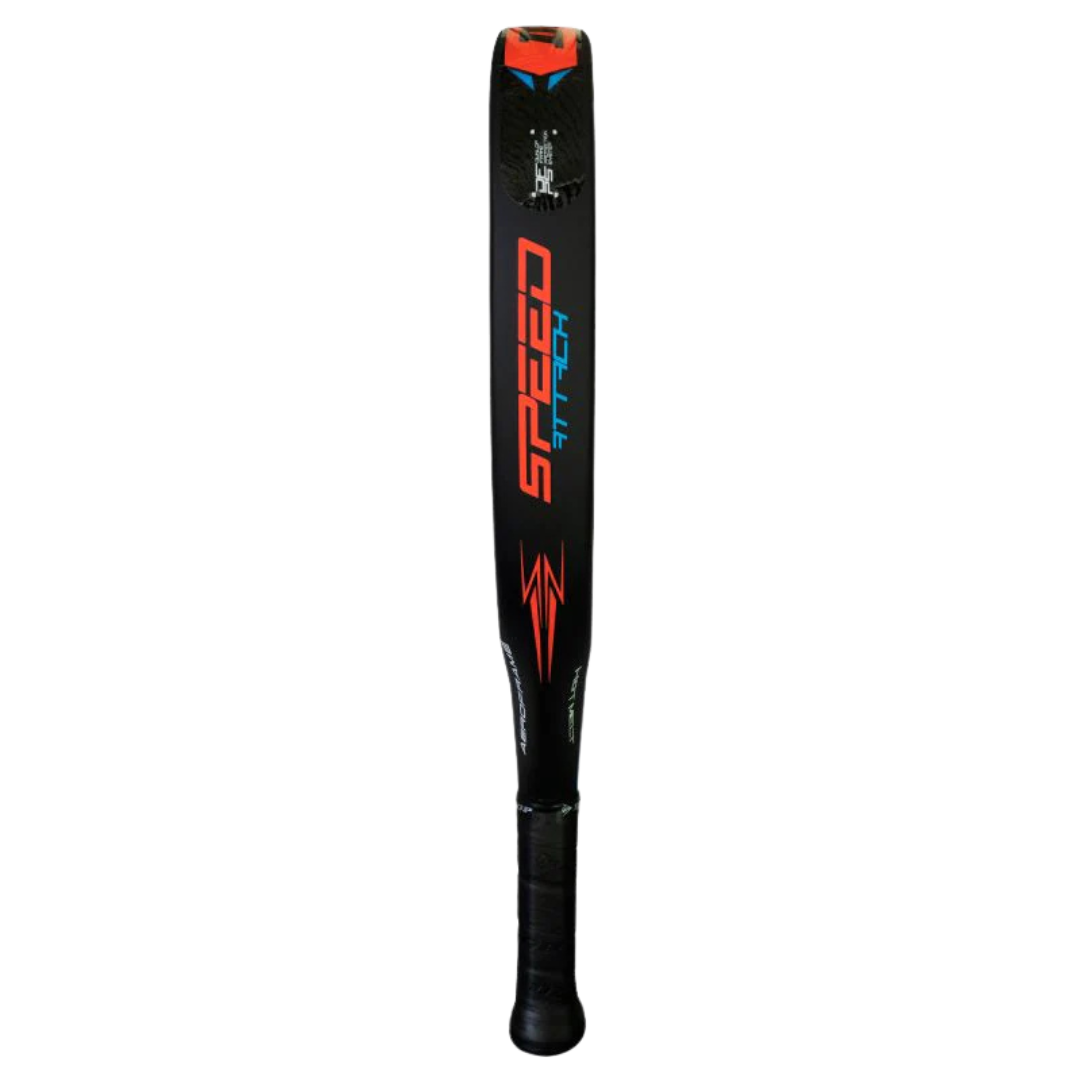 The Dunlop Speed Attack padel racket features a premium graphite build and uses Aeroframe technology for enhanced maneuverability and faster swing speeds, resulting in greater power.